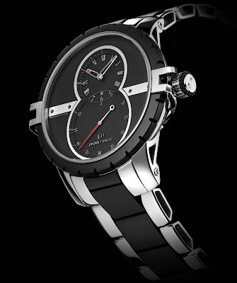 Auch ausgehöhlt, die Platten diskret betonen die Dominanz der abgerundeten Konturen. Das Armband ist aus Stahl gefertigt - ein erster für Jaquet Droz. Fall und die Krone und Lünette ist in geschmeidigem Naturkautschuk. In diesem Jahr verstärkt Jaquet Droz ihre Sports Watch (SW) Linie mit einem Tourbillon-Modell. Im Jahr 2008 eingeführt, ist die Sportuhr (SW) Linie aus innovativen Uhren. Es ist zum ersten Mal; Jaquet Droz ist eine der schwierigsten Komplikationen der Uhrmacherei in der Sportwagen-Uhr (SW).