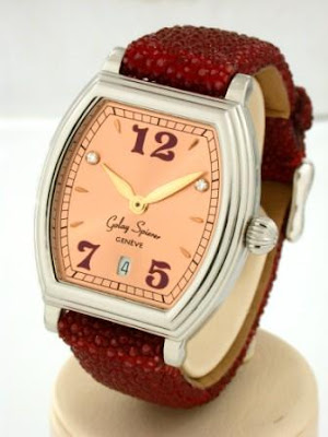 Diese personalisierte Tonneau Damenuhr mit Automatikaufzug und Sonnenuhr-Zifferblatt mit 2 Diamanten wurde von Golay Spierer im Jahr 2002 kreiert. Technische Daten: Uhrwerk: Automatikaufzug. Kaliber ETA 2004, Frequenz: 28'800 alt / h. Dicke: 3,6 mm, Handgraved Rotor. Rundkornplatte, Farbe: Rotgold 4N, gedrehte blaue Schrauben. Gehäuse: Material: 316L Edelstahl, Abmessungen: 32,0 x 38,0 mm, Dicke: 1,5 mm. Wasserdichtigkeit: 100 Meter, Kugel Krone mit einem Diamanten besetzt. Ziffernblatt: Matierial: Rotgold 4N, Sunbrush-Zifferblatt mit 2 Diamanten besetzt, bordeauxrote Ziffern aufgedruckt, "Drops" aufgesetzte Kapitel. Hände: Material: Rotgold 4N; Blätter geformte Hände, handgefertigt.